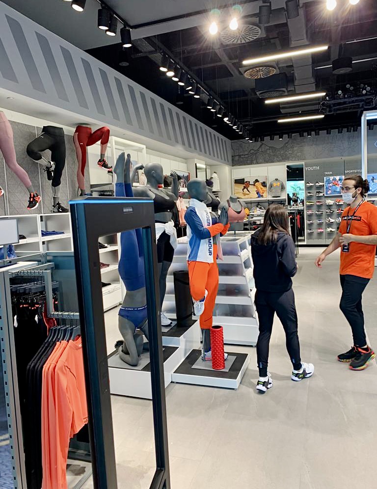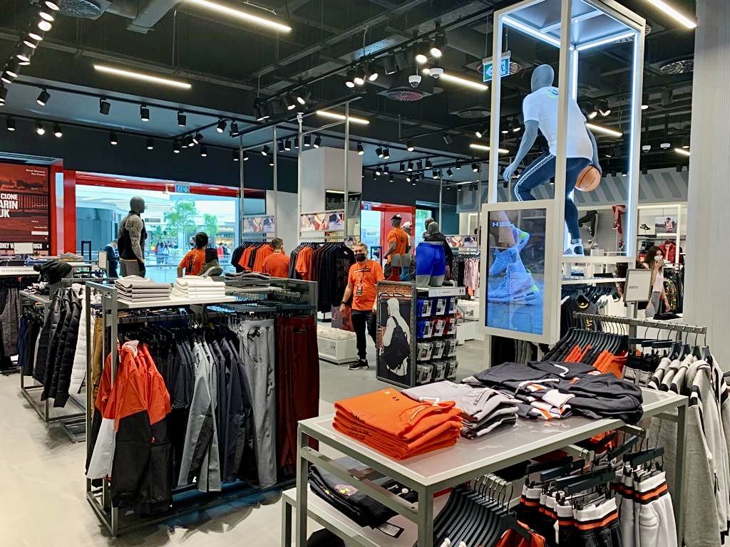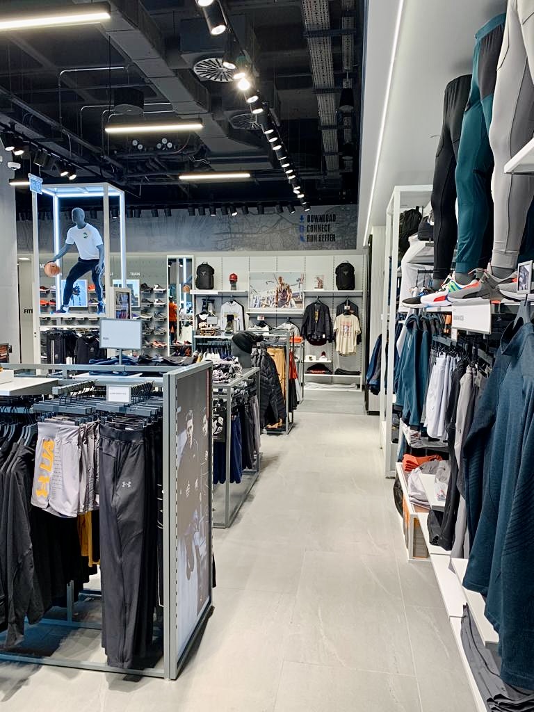 İzmir İstinye Park AVM'deki Under Armour mağazası tezgah, raf ve askılıkları.